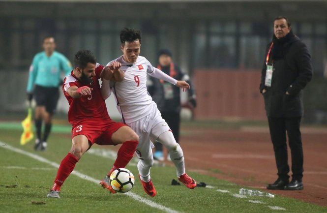 Pha tranh bóng giữa Văn Toàn (áo trắng) và một cầu thủ U23 Syria (Ảnh N.K/TTO)