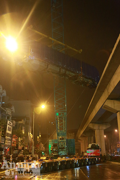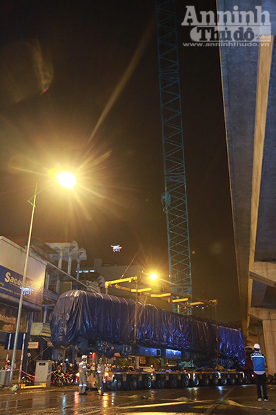 Đúng 1h kém 15, chiếc container siêu trường, siêu trọng với 108 bánh chở toa tàu vào khu vực cần cẩu sau 2 ngày tập kết tạm thời tại khu đô thị Văn Phú, Hà Đông.