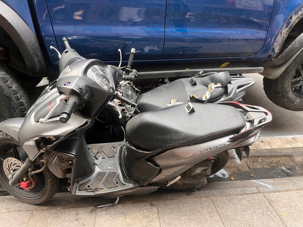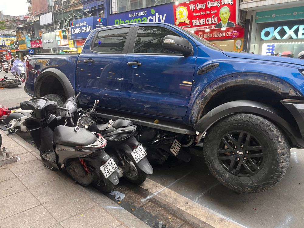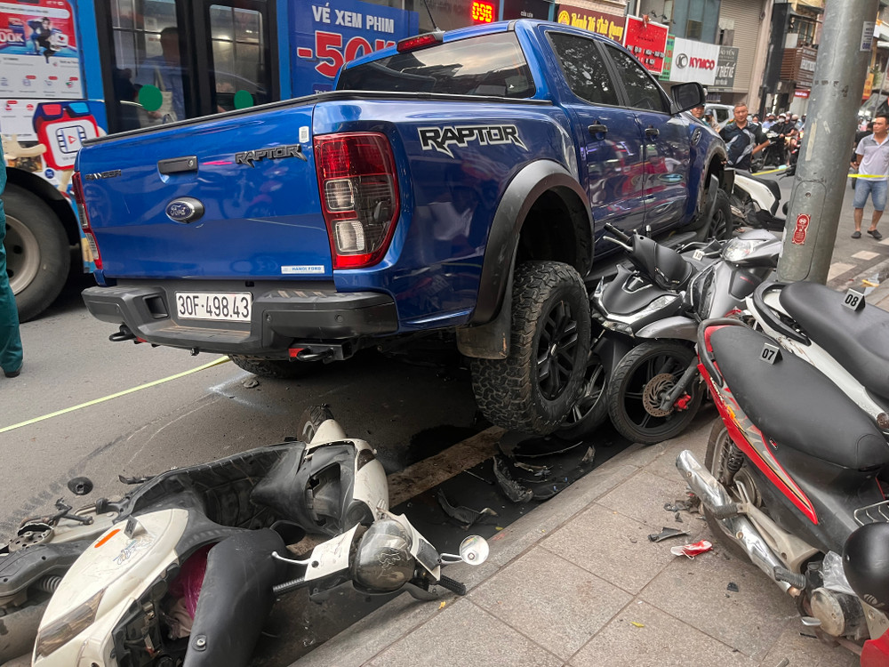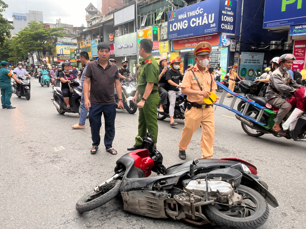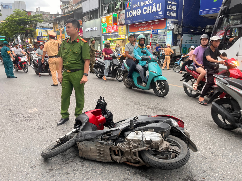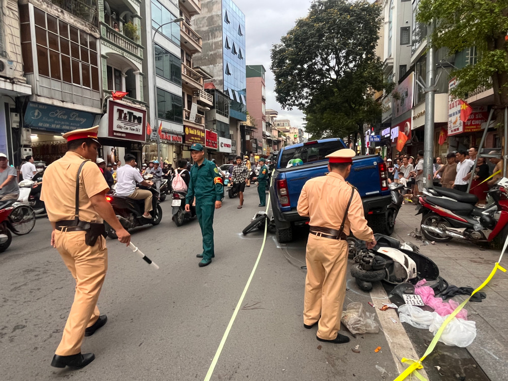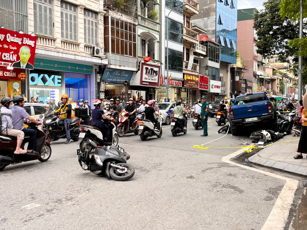 Cận cảnh hiện trường vụ ô tô bán tải húc, kéo xe máy ở phố Khâm Thiên