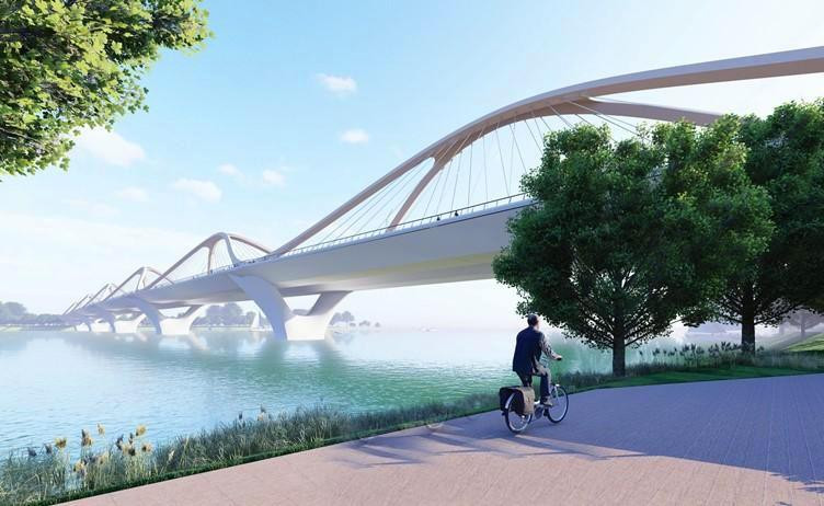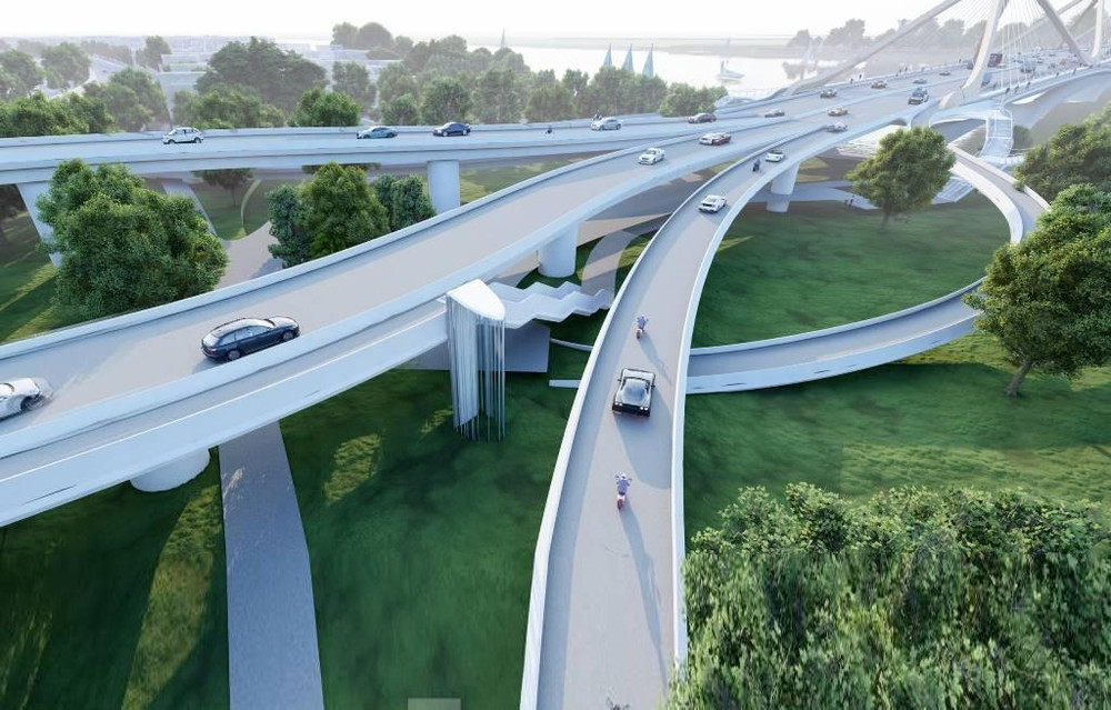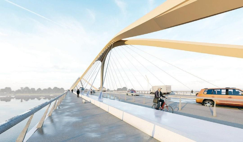 ANTD.VN - Thành phố Hà Nội vừa có quyết định phê duyệt phương án kiến trúc cầu Trần Hưng Đạo đoạt giải Nhất trong cuộc thi tuyển chọn ý tưởng độc đáo cho cầu. Với phương án kiến trúc này, cầu Trần Hưng Đạo vượt sông Hồng có dầm cầu là bê tông cốt thép, hình dáng kiến trúc phía trên cầu sử dụng kết cấu cầu dạng vòm thép, sơ đồ nhịp 150mx6, mặt cắt ngang cầu tại giữa nhịp là rộng 40,6m - tương đương 6 làn xe cơ giới.