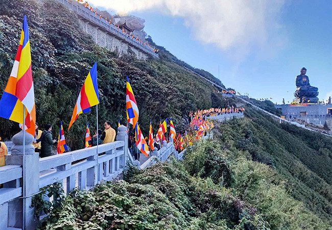 Để đón mừng Đại lễ, khu du lịch Sun World Fansipan Legend đã mở cửa sớm hơn thường lệ. Từ sáng sớm, nhiều đoàn du khách và Phật tử đã không khỏi ngỡ ngàng trước không gian ngợp ngời cờ hoa của quần thể kiến trúc tâm linh trên khu vực đỉnh Fansipan trong ngày đặc biệt này.