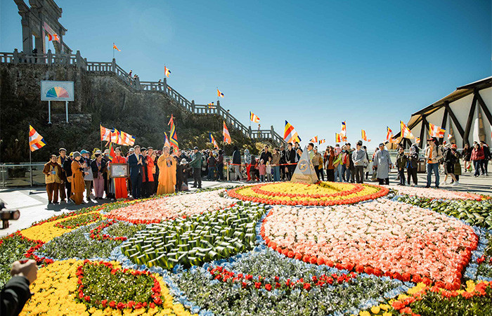 Đặc biệt, tại khu vực Sân Mây, đại cảnh “Vạn hoa dâng Phật” lớn nhất Việt Nam, kết tạo hình một đoá hoa sen từ hàng ngàn bông hoa tươi, có diện tích lên tới 99m2, đã trở thành điểm check-in khiến nhiều Phật tử và du khách trầm trồ.