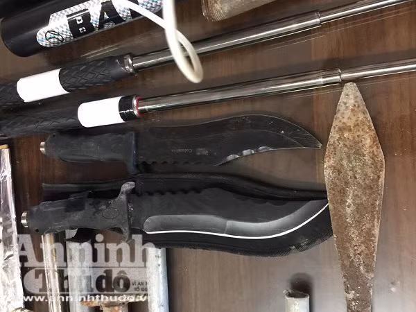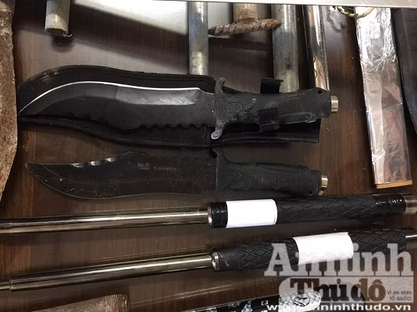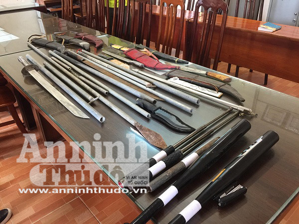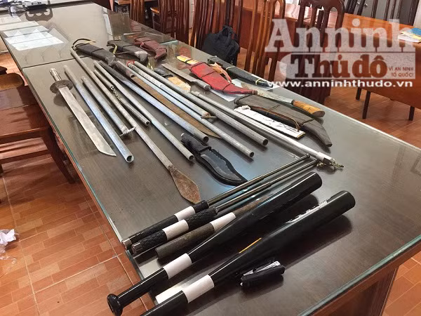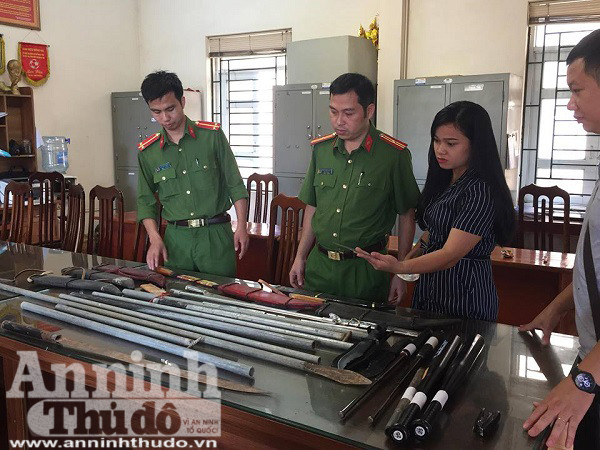 ANTD.VN - Qua công tác điều tra, khám xét lực lượng Công an huyện Thạch Thất, Hà Nội đã thu giữ số lượng lớn dao, kiếm, gậy 3 khúc, giáo, mác tại nơi làm việc của các đối tượng trong vụ bắt cóc "con nợ" để đòi tiền xảy ra ngày 16-7, tại xã Canh Nậu, huyện Thạch Thất.