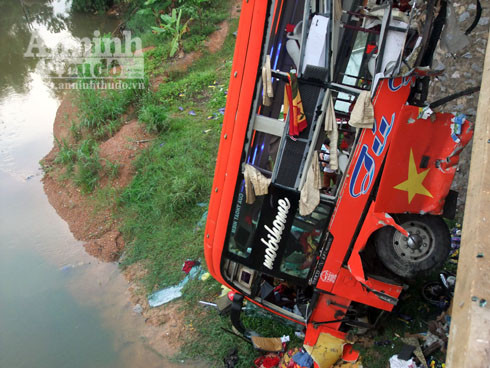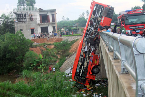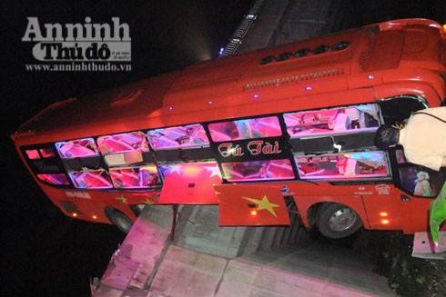 Chiếc xe khách treo lơ lửng trên thành cầu sau khi xảy ra TNGT