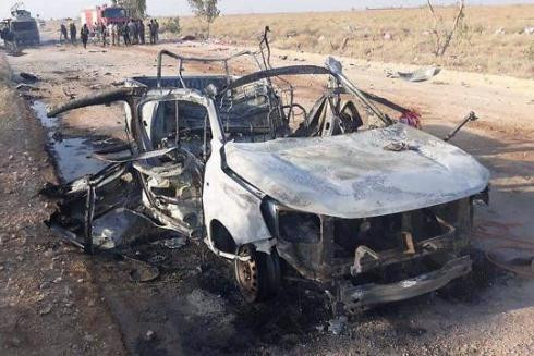 Một chiếc xe bị phá hủy sau trận không kích gần biên giới Syria - Iraq