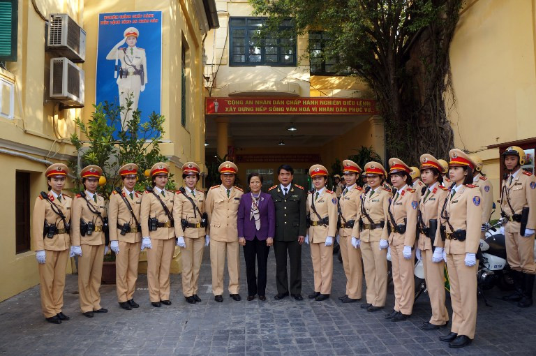 Đồng chí Ngô Thị Doãn Thanh và Thiếu tướng Nguyễn Đức Chung chụp ảnh lưu niệm với CBCS Phòng CSGT (Ảnh Phú Khánh)