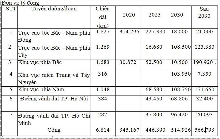 Tổng cục Đường bộ đưa ra dự kiến tổng nhu cầu vốn đầu tư của từng đoạn tuyến cao tốc (không bao gồm các tuyến cao tốc đang triển khai hoặc chuẩn bị triển khai đã xác định được nguồn vốn) như sau: