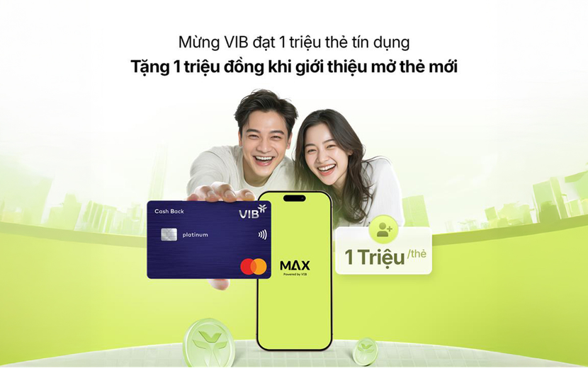 Mừng cột mốc 1 triệu thẻ, VIB tặng đến 1 triệu đồng cho chủ thẻ giới thiệu bạn bè mở thẻ qua ứng dụng Max. Mức thưởng là 400.000 VNĐ/thẻ khi giới thiệu thẻ Ivy Card, Family Link, Super Card, Financial Free; 800.000 VNĐ/thẻ khi giới thiệu thẻ Online Plus 2in1, Rewards Unlimited; Và 1.000.000 VNĐ/thẻ khi giới thiệu thẻ Travel Élite, Premier Boundless, Cash Back. Chủ thẻ sẽ được miễn phí thường niên trọn đời nếu giới thiệu thành công 5 thẻ/tháng.