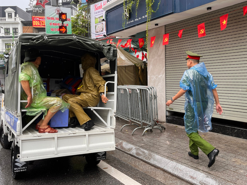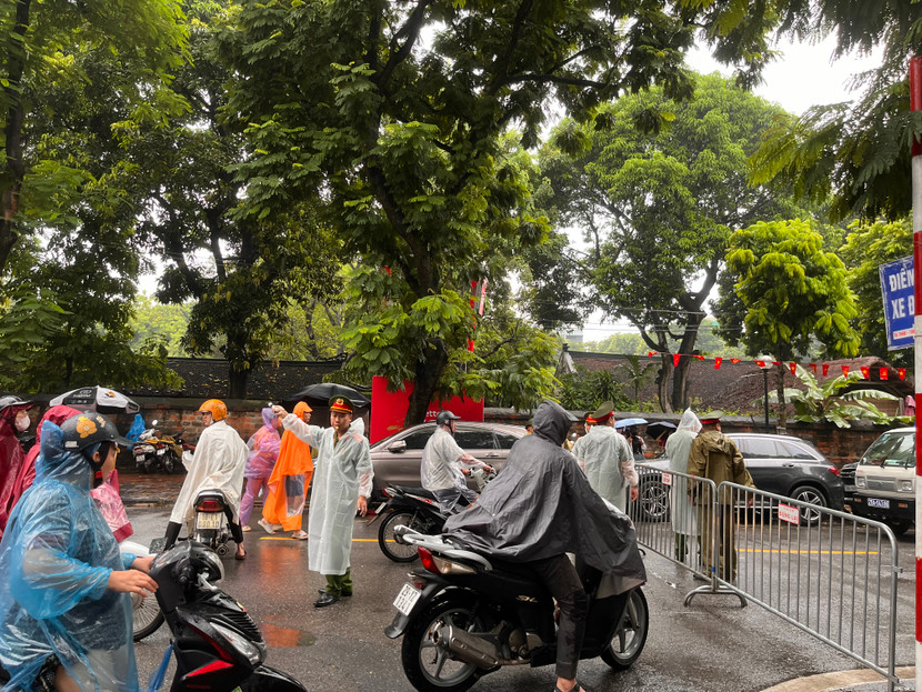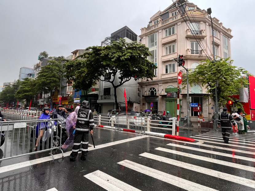 Ghi nhận tại ngã tư Nguyễn Thái Học - Chu Văn An, khoảng 11h trưa 27-8, rất đông người dân cả người già và trẻ nhỏ mặc áo mưa, đội ô ngồi chờ đến giờ diễu binh. Các CBCS Công an phường Văn Miếu - Quốc Tử Giám và các lực lượng chức năng căng mình, dầm mưa để điều tiết giao thông, hướng dẫn phân luồng các phương tiện. Trung tá Quách Anh Tuấn - Trưởng Công an phường Văn Miếu - Quốc Tử Giám, cùng Trung tá Đậu Khánh Hoàn, Phó Trưởng Công an phường đang cùng các cán bộ chiến sỹ điều chỉnh phương án phù hợp với điều kiện và tình hình thực tế, hướng dẫn người dân di chuyển an toàn.