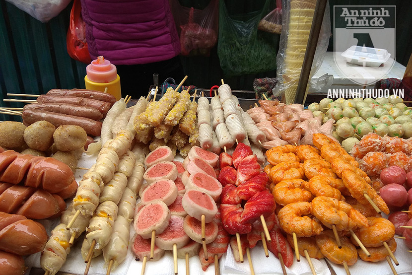 Thực phẩm được bày bán như xúc xích, chả cá... thường được bọc trong túi nilon xanh hoặc đóng trong bao bì ghi tiếng Trung Quốc, không rõ nơi xuất xứ, không đề ngày sản xuất và hạn sử dụng. Dụng cụ chế biến cũng hoàn toàn không được vệ sinh sạch sẽ, cáu bẩn bám đầy thành bếp và chảo rán. Dầu ăn thậm chí được sử dụng lại nhiều lần, túi rác đặt cạnh nơi chế biến đồ ăn, tương ớt không rõ nguồn nhập.