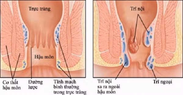 Trĩ ngoại: liên quan đến các tĩnh mạch xung quanh hậu môn. Trĩ ngoại có thể gây ngứa hoặc đau và đôi khi có thể kèm theo chảy máu.
