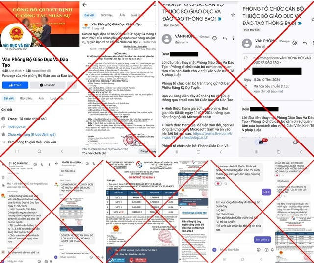 Bộ GD-ĐT cho biết, hiện đang xuất hiện nhiều trang thông tin, nhóm Zalo, email mạo danh các đơn vị của Bộ để cung cấp thông tin, trong đó đăng tải nhiều hình ảnh, bài viết có nội dung phương thức, thủ đoạn lừa đảo chiếm đoạt tài sản.