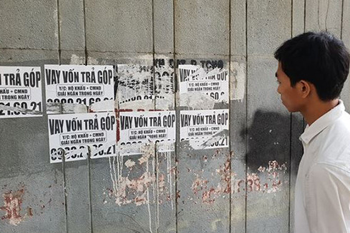 Tờ rơi quảng cáo cho vay tiền được dán ở khắp nơi. Ảnh: Báo Tiền phong