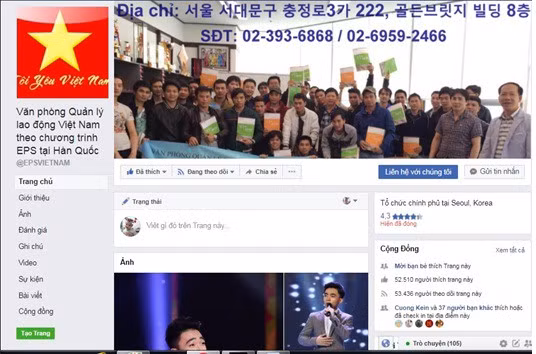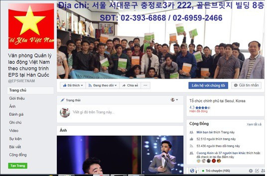 Giao diện trang Fanpage chia sẻ thông tin hỗ trợ lao động đi làm việc tại Hàn Quốc theo chương trình EPS