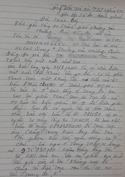 Đơn trình báo của 1 nạn nhân gửi đến CAQ Đống Đa, Hà Nội.