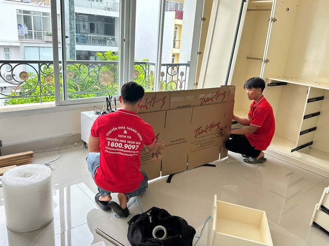 - Nhân viên bốc xếp mặc áo thun đỏ, có logo rõ ràng - Thùng carton thành hưng có in logo Thành Hưng