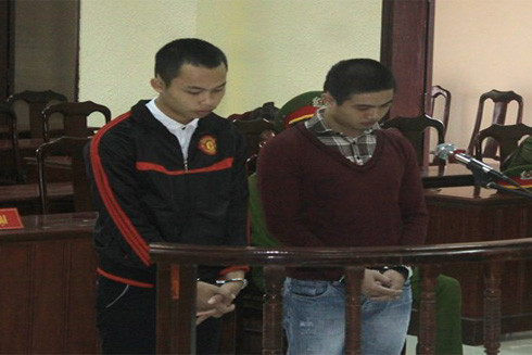 Lê Văn Tư (bên trái ảnh) cùng Cao Văn Hiếu tại phiên tòa xét xử tội lừa đảo chiếm đoạt tài sản qua mạng xã hội facebook