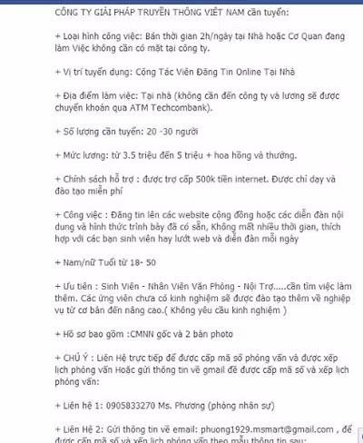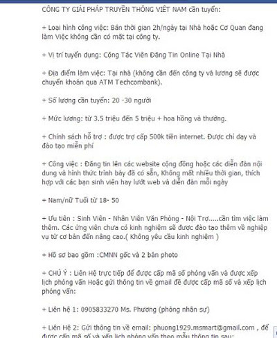 - Đăng tuyển dụng trên Facebook chỉ để số điện thoại của người tuyển, không để địa chỉ công ty, website công ty.