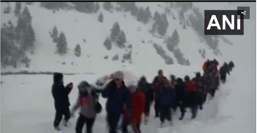 Sống trên dãy Himalaya, nhóm dân làng ở Lahaul-Spiti, bang Himachal Pradesh hôm 17-1 đã tập hợp thành một nhóm hỗ trợ viên cảnh sát địa phương đến nơi an toàn, dù phải trải qua hành trình đi bộ đường dài.