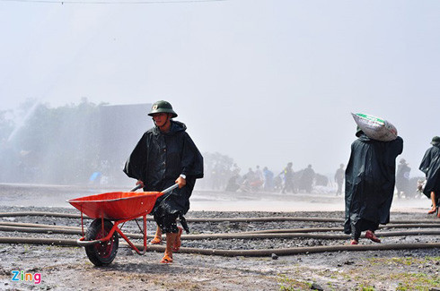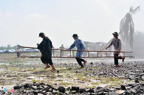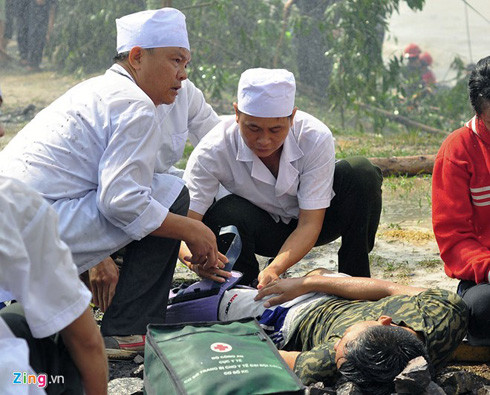 Các y, bác sĩ làm nhiệm vụ sơ - cấp cứu cho những người bị thương. Trong điều kiện mưa, gió, họ buộc thực hiện thao tác nhanh, an toàn để cứu người.