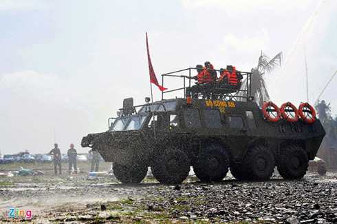 Các xe lội nước đặc chủng của lực lượng công an tiếp cận hiện trường cứu người.