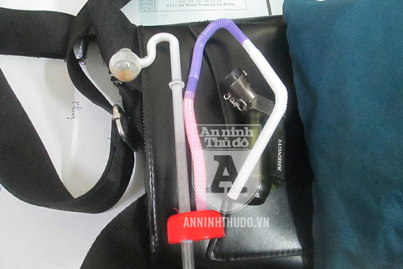 Khi vừa mở cốp xe máy, người phụ nữ liền lén rút trong túi đeo trên người ra một chiếc túi khác nhỏ hơn, rồi... giấu sau lưng. Hành vi bất thường này lập tức bị cảnh sát phát hiện, yêu cầu đưa chiếc túi ra để kiểm tra. Bên trong chiếc túi "giấu sau lưng" này có một cóng chứa ma túy đá đã được đốt sơ, bật lửa "khò". Đây là bộ dụng cụ hút ma túy đá của các "dân chơi".