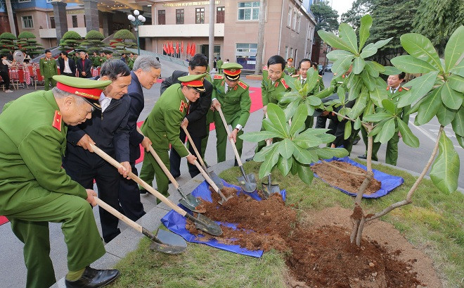 Các cán bộ lãnh đạo trồng cây lưu niệm tại Bộ Tư lệnh Cảnh sát cơ động