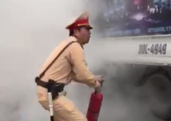 CSGT mỗi người một việc, vừa sử dụng bình bọt chữa cháy, hỗ trợ lái xe đưa hàng hóa xuống, đồng thời phân luồng giao thông cho dòng phương tiện trên đường đi đảm bảo an toàn. Sau nhiều nỗ lực của CSGT, lái xe, ngọn lửa đã hoàn toàn được dập tắt. Chiếc xe không bị hư hỏng nặng. Chứng kiến tinh thần hết lòng vì nhân dân phục vụ của CSGT, anh Thắng xúc động cầm chặt tay các chiến sỹ CSGT cảm ơn.