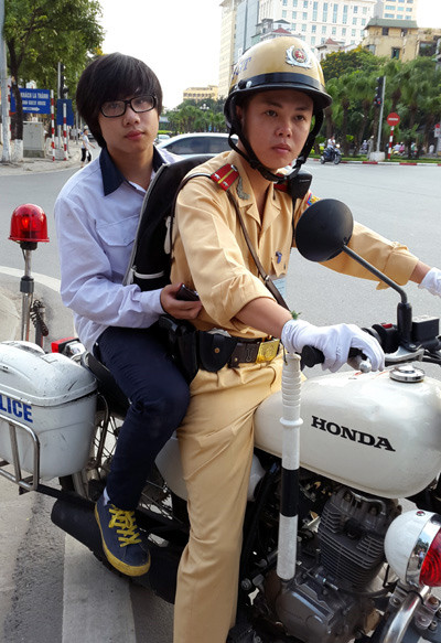 Thấy CSGT tiến lại gần, khuôn mặt của em học sinh lộ rõ vẻ mừng rỡ. Em học sinh trên là Nguyễn Phương Nam, học lớp 12 trường THPT Hồ Tùng Mậu, nhà ở 657 Hoàng Hoa Thám, quận Ba Đình, Hà Nội. Nam cho biết trên đường từ nhà đến trường để thi môn thứ hai, chiếc xe chở em đã xảy ra va chạm với một phương tiện khác. Mặc dù chỉ bị đau nhẹ song chiếc xe bị hỏng, nguy cơ Nam phải bỏ lỡ buổi thi trước mắt là có thể xảy ra.