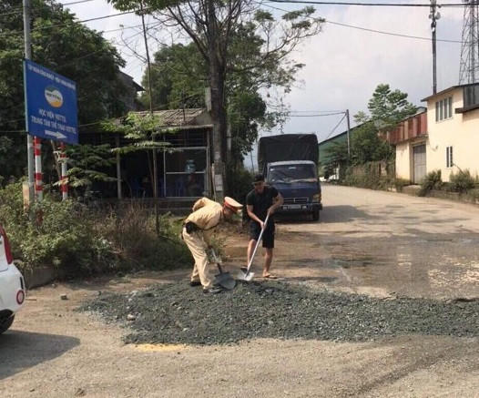 Lực lượng CSGT cùng người dân san lấp các "ổ trâu" đảm bảo an toàn cho người tham gia giao thông
