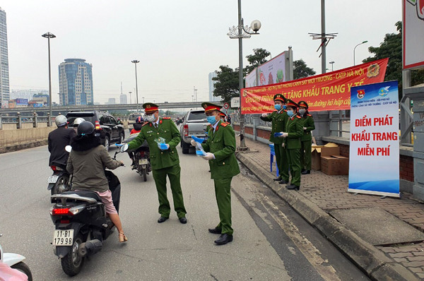 Một điểm phát khẩu trang miễn phí cho người dân của lực lượng Cảnh sát môi trường Công an thành phố Hà Nội