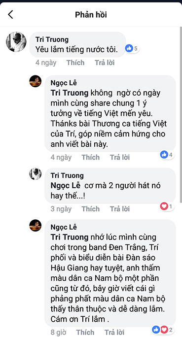 Đến khi thấy nhạc sĩ Đức Trí viết “Thương ca tiếng Việt” và Hoài An viết “Tiếng Việt” hay quá tôi mới cảm thấy đến lúc mình phải hoàn thành thôi nên ngồi lên đàn viết tiếp rồi cùng Phương Thảo hòa âm và thu âm tại nhà. Lúc thu cả hai chúng tôi cũng đều rất xúc động bởi chính bài hát mình viết. Cảm thấy thật tự hào vì cùng bạn bè mỗi người góp một tay làm đẹp cho tiếng Việt mến yêu của chúng ta”.