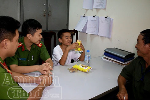 Sau một tháng đi lạc từ Sơn La xuống đến Hà Nội, Giá được các chú Công an phường Hạ Đình đưa về trụ sở chăm sóc để tìm người thân giúp cháu trở về với gia đình