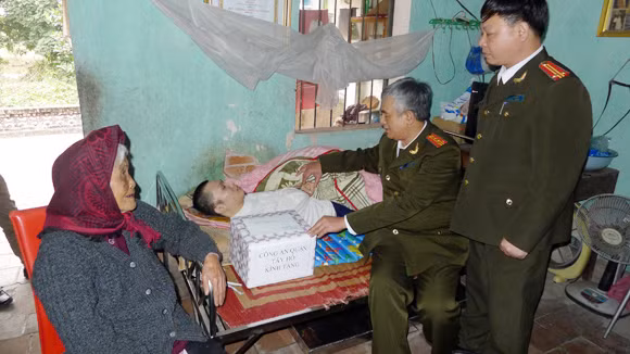 Sự xuất hiện không báo trước của những người đồng đội, đồng chí, bên người cháu nội nằm liệt giường, co quắp trong 3-4 lớp chăn bông, khiến cụ Xúy mừng mừng, tủi tủi. Vừa hồ hởi đón khách, cụ Xúy vừa chầm chậm bước vào góc nhà, lần tìm vài chiếc ghế ra mời khách ngồi. Chứng kiến những bước di chuyển khó nhọc, Đại tá Nguyễn Tiến Chiến cùng 2 cán bộ nhanh chân bước tới, đỡ cụ Xúy rồi ân cần dìu ra bên chiếc giường - nơi người cháu nội đang nằm liệt trò chuyện. Nói là trò chuyện, nhưng cụ Xúy bị nặng tai, nghe câu được câu chăng, chỉ luôn miệng một câu: “Cảm ơn các anh đã thương tình”.