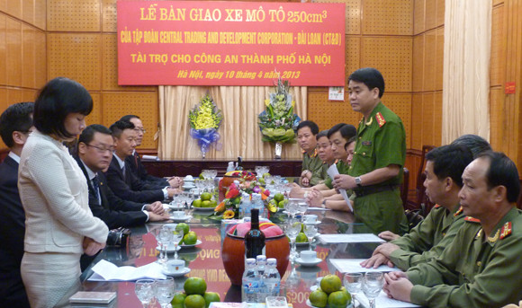 Chiều nay (10-4), Công an thành phố Hà Nội đã tổ chức Lễ bàn giao 35 xe mô tô Honda 250 cm3 của Tập đoàn Central Trading & Development Đài Loan (CT&D) tài trợ cho Công an thành phố Hà Nội. Tham dự buổi lễ có Thiếu tướng Nguyễn Kim Quy – Phó Tổng cục trưởng Tổng cục An ninh I, các đồng chí lãnh đạo Tổng cục Hậu cần kỹ thuật, Công an thành phố Hà Nội và đoàn công tác Tập đoàn CT&D.