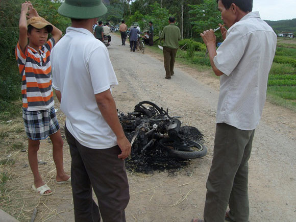 Ngay sau đó chiếc xe máy của 2 đối tượng cũng bị người dân châm lửa đốt cháy thành than. Người dân cũng thu giữa được một bao tải đựng 3 con chó và một bộ dụng cụ của đối tượng dùng để hành nghề.