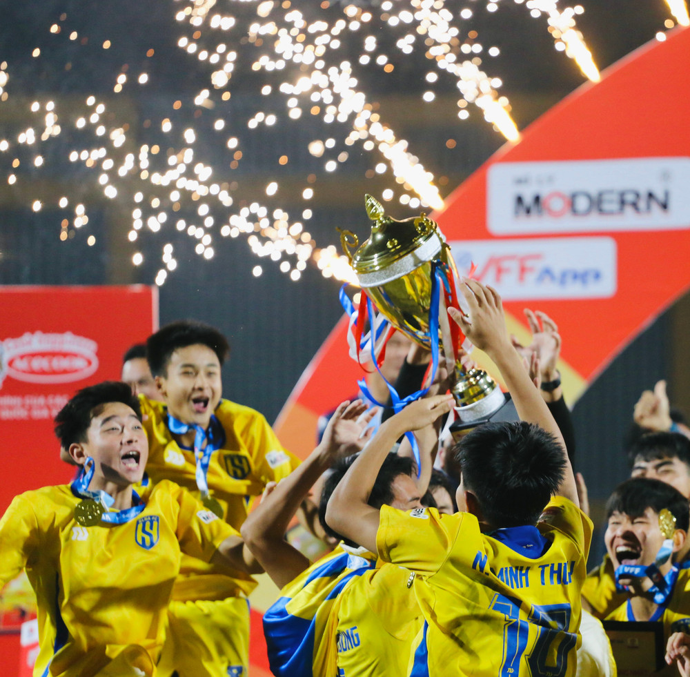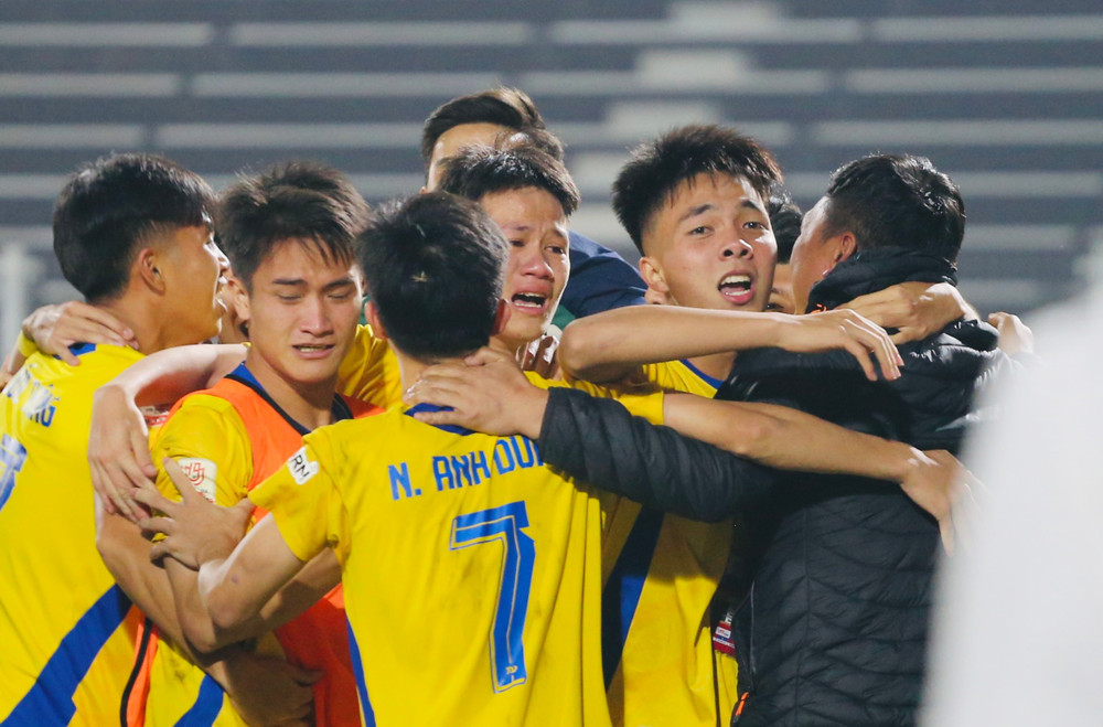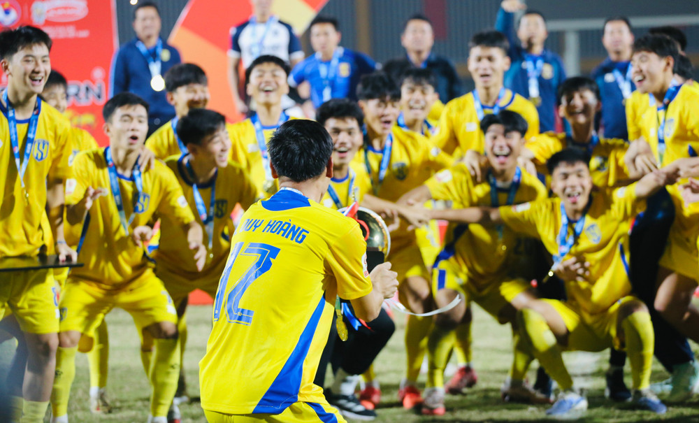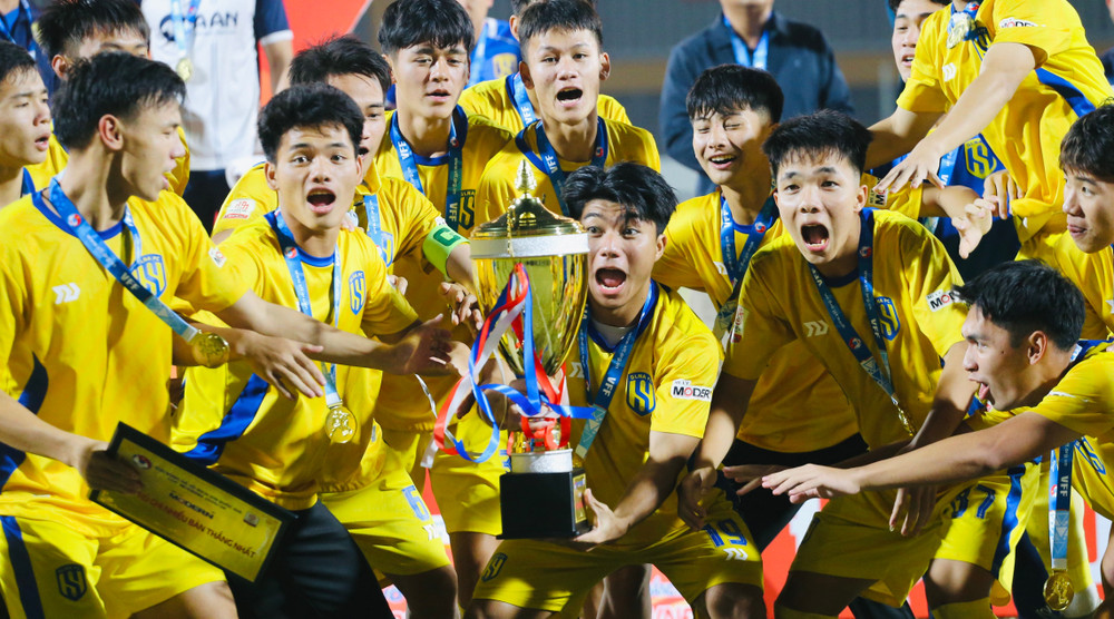 ANTD.VN - Sau chiến thắng luân lưu nghẹt thở trước chủ nhà PVF-CAND, cầu thủ SLNA công kênh huấn luyện viên, phấn khích ăn mừng chức vô địch U19 quốc gia 2025/26.