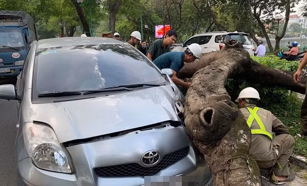 Cây đổ đè trúng xe ô tô đang lưu thông