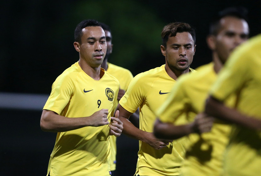 Talaha (bên trái) cùng tuyển Malaysia tập tại Mỹ Đình tối 14-11