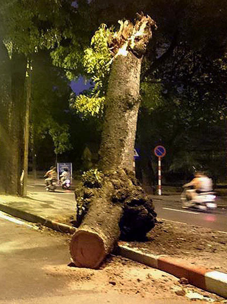 Thời điểm xảy ra sự cố, trời đang có mưa và gió to. Cây xà cừ cổ thụ có đường kính gần 1m bị gãy ngang thân. Phần thân và tán cây phía trên gãy đổ chắn ngang đường. Rất may thời điểm cây gãy đường vắng người qua lại nên không gây thương vong cho người tham gia giao thông.