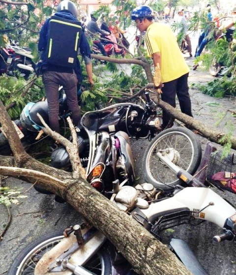 Một cô gái đi xe máy bị tán cây quật trúng, trầy xướt nhẹ. Riêng 2 người còn lại không bị sao, 3 phương tiện bị nhánh cây đè lên, hư hỏng.