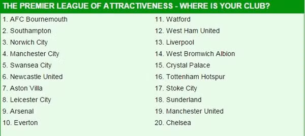 CĐV M.U có vẻ hấp dẫn hơn so với đại kình địch Chelsea, nhưng cứ 1 trong 10 người được hỏi cho biết họ không muốn hẹn hò với người hâm mộ của Quỷ đỏ. Trái lại, các đội bóng đến từ bờ biển phía Nam luôn nhận được những ánh mắt thiện cảm, với Southampton chia sẻ ngôi đầu cùng tân binh Bournemouth trên bảng xếp hạng.