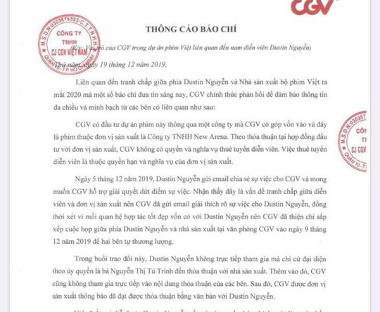 Phía CGV cho biết, ngày 5-12-2019, Dustin Nguyễn có gửi email chia sẻ về sự việc và mong muốn CGV hỗ trợ giải quyết dứt điểm. Nhận thấy đây là vấn đề tranh chấp giữa diễn viên và đơn vị sản xuất phim nên CGV đã gửi email giải thích rõ sự việc cho Dustin Nguyễn, đồng thời vì mối quan hệ hợp tác tốt đẹp vốn có với nam diễn viên này nên CGV đã thiện chí sắp xếp một cuộc họp giữa Dustin Nguyễn và nhà sản xuất tại văn phòng CGV vào ngày 9-12-2019 để hai bên tự thương lượng. Trong buổi gặp gỡ trao đổi này, Dustin Nguyễn không tham gia trực tiếp mà cử đại diện theo ủy quyền là bà Nguyễn Thị Tú Trinh đến thỏa thuận với nhà sản xuất. Thêm vào đó, CGV cũng không tham gia trực tiếp vào nội dung thỏa thuận của các bên. Sau đó, CGV được phía nhà sản xuất thông báo đã đạt được thỏa thuận bằng văn bản với Dustin Nguyễn.
