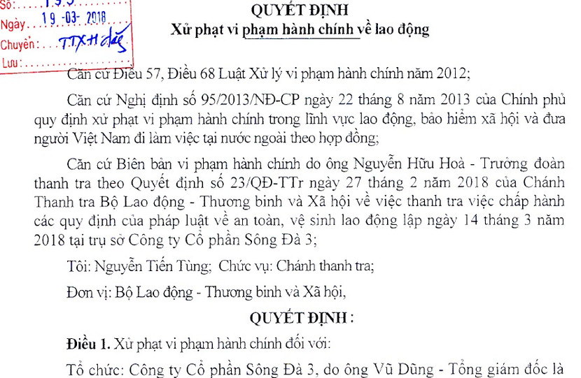 Mức hình thức xử phạt bằng tiền áp dụng đối với Công ty Cổ phần sông Đà 3 là 150 triệu đồng.