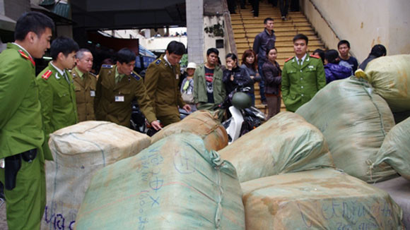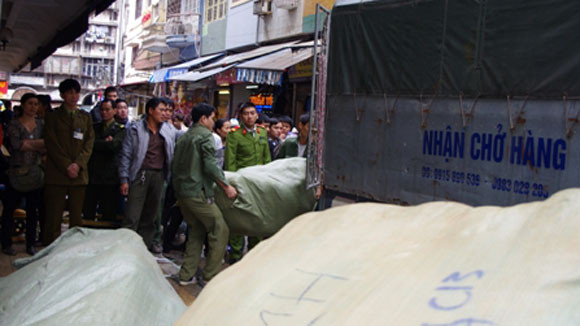 Sáng 5-12, từ điểm phục kích, các trinh sát Đội CSĐT tội phạm về TTQLKT&CV- CAQ Hoàn Kiếm phát hiện nhiều phương tiện chở từng bao tải hàng hóa tập kết tại khu vực trước cửa số 13 chợ Đồng Xuân (phía phố Cầu Đông).