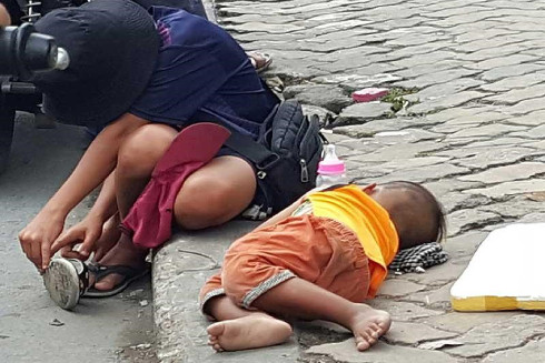 Một đứa trẻ ăn xin vạ vật trên hè đường tại TP. Hồ Chí Minh (Ảnh: Báo Pháp luật TP. Hồ Chí Minh)