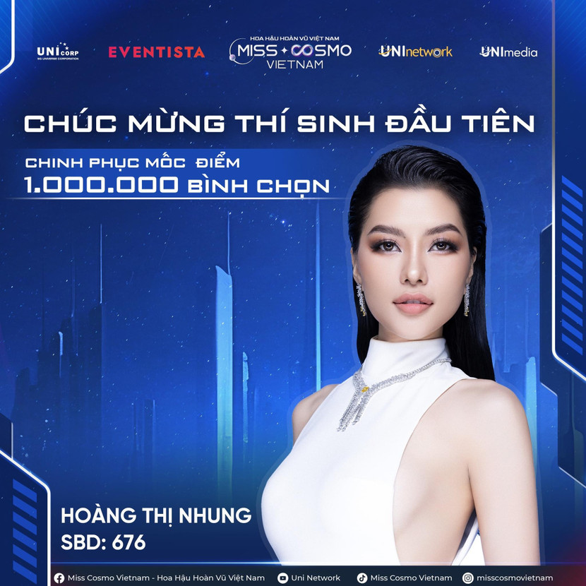 Sau những phần trình cuốn hút tại đêm bán kết và trình diễn trang phục dân tộc, thí sinh Hoàng Nhung đã nhận được sự yêu mến của quý khán giả và bứt phá vươn lên trở thành thí sinh đầu tiên chinh phục mốc điểm 1 triệu lượt bình chọn.
