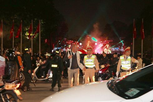 Cũng tại khu vực trung tâm Thủ đô, chúng tôi đã tiếp xúc với một số CBCS của CAQ Hoàn Kiếm, Phòng CSGT và Trung đoàn CSCĐ - CATP Hà Nội đang thực thi nhiệm vụ. Ai nấy đều rất vui và mặc dù công việc bận rộn, vất vả và căng thẳng, nhưng trên môi những chiến sỹ trẻ luôn nở nụ cười tươi rói. Thiếu úy Nghiêm Xuân Minh, chiến sỹ Đội CSGT số 1, Phòng CSGT - CATP Hà Nội chia sẻ: “Năm nay là năm thứ ba liên tiếp tôi được phân công làm nhiệm vụ phân luồng, đảm bảo ATGT tại ngã tư Tràng Tiền - Hàng Bài. Tôi vinh dự lắm khi được tham gia làm nhiệm vụ đêm giao thừa và mục đích tôi hướng tới là phục vụ nhân dân được tốt nhất”.