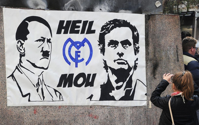Trên đường dẫn đến sân Bernabeu trước trận Real Madrid tiếp Levante (Kền kền trắng thắng 5-1), người ta bắt gặp một banner rất lớn vẽ Jose Mourinho và Hitler.
