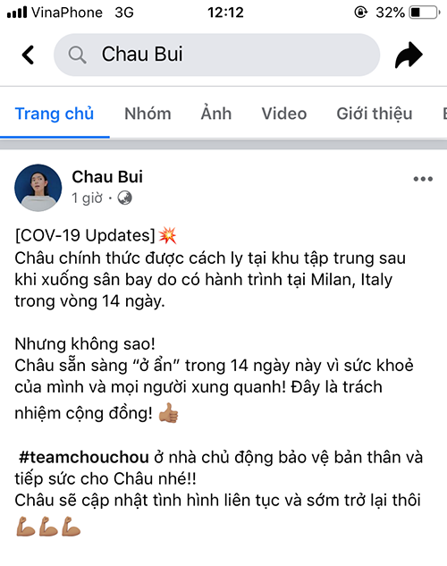 Cô viết:" Châu chính thức được cách ly tại khu tập trung sau khi 14 xuống sân bay do có hành trình tại Milan, Italy trong vòng 14 ngày. Nhưng không sao. Châu sẵn sàng "ở ẩn" trong vòng 14 ngày này vì sức khoẻ của mình và mọi người xung quanh. Đây là trách nhiệm cộng đồng".
